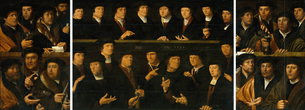 En neerlandés, el oficio de sereno o guardia nocturno recibe un nombre muy similar al que tiene en alemán: nachtwaker, en vez de Nachtwächter. Esto viene a cuento del cuadro que escogimos para ilustrar esta publicación: De Nachtwacht, una de las pinturas más célebres del holandés Rembrandt, obra insigne del Barroco flamenco, con una magistral utilización de la técnica del claroscuro, tan típica en esa escuela artística. Se trata de un óleo sobre lienzo de dimensiones monumentales (3,59 metros de altura por 4,38 metros de largo), realizada entre 1639 y 1642, hoy exhibida en el Rijksmuseum de Ámsterdam. El verdadero título de la pintura es La compañía militar del capitán Frans Banninck Cocq y el teniente Willem van Ruytenburgh, pero en los siglos XVIII y XIX el artista inglés Joshua Reynolds y los críticos franceses la empezaron a llamar Night Watch y Patrouille de Nuit, nombre que sería castellanizado como Ronda nocturna. Se trata de un malentendido. Cuando la obra fue restaurada en 1947 (se le quitó la capa de barniz oxidado y suciedad acumulada que la oscurecían), se descubrió que la patrulla de vigilantes no era nocturna sino diurna: la composición estaba ambientada al interior de un portalón en penumbra, donde un rayo de sol ilumina vivazmente a los personajes. Aunque errado, el nombre subsistió hasta la actualidad, por inercia de la tradición. Ronda nocturna muestra un contingente de veinte schutters o milicianos –una compañía de la Corporación de Arcabuceros de Ámsterdam– a punto de iniciar su marcha de vigilancia policial por las calles de la ciudad. Fue precisamente esta milicia municipal (schutterij) la que le encargó el cuadro a Rembrandt para decorar el salón principal de su sede, con motivo de su inauguración, que se celebraría con un banquete. El pintor recibió 1.600 florines –una suma cuantiosa– por su trabajo. Fueron los propios arcabuceros representados en el lienzo los que le pagaron, a razón de cien florines por cabeza (aunque algunos de ellos se demoraron en abonar su parte porque quedaron disconformes con la escasa visibilidad de sus figuras). De Nachtwacht es una típica pintura barroca de la Edad de Oro holandesa, de la Holanda republicana del siglo XVII, una Holanda calvinista a la vanguardia del desarrollo capitalista, con su oligarquía de regenten (comerciantes, banqueros, terratenientes, empresarios industriales y navieros) concentrado riqueza, poder y estatus en detrimento de la plebe. A diferencia de Proudhon, estos burgueses no pensaban que la propiedad fuese un robo, pero sí temían que sus propiedades fuesen asaltadas o saqueadas por el «populacho». Por eso patrullaban con tanto celo las calles de sus barrios citadinos, de día y de noche, organizándose a tal efecto en guardias cívicas, bien pertrechadas con armas de fuego y armas blancas. Los retratos grupales de milicianos burgueses, las schuttersstukken, llegaron a ser todo un género pictórico del Flandes renacentista y barroco. La schuttersstuk más famosa es la de Rembrandt, pero la más antigua es el Tríptico de los arcabuceros, un óleo sobre tabla de Dirck Jacobsz que data de 1529 (ver abajo la reproducción).