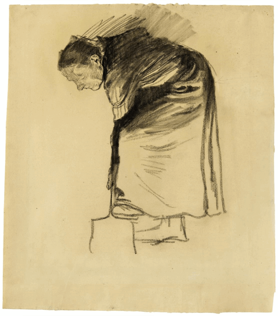 Un boceto de composición temprano, aparecido recientemente, el dibujo NT (443a), trata el tema de forma mucho más narrativa. Delante de la mujer del campesino asesinada están sus dos hijas. La mayor mira al interior de la casa a través de la abertura de una puerta rota y torcida en las bisagras, mientras que la menor se aferra asustada a su hermana y mira horrorizada a su madre.