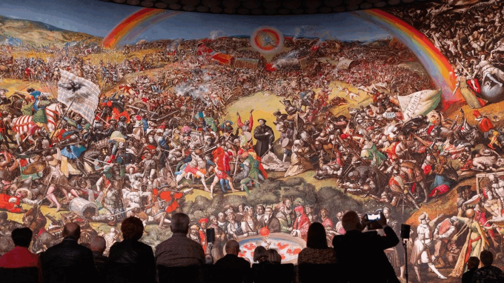 Desde luego, no es insignificante que la batalla de Frankenhausen ocupara un lugar especial en la historiografía de la RDA [la vieja Alemania oriental socialista] y que la Guerra de los Campesinos en general se interpretara como parte de la “revolución protoburguesa”, representada por Werner Tübke en el Museo Panorama sobre el Schlachtberg [ver fotografía al final de la entrevista].