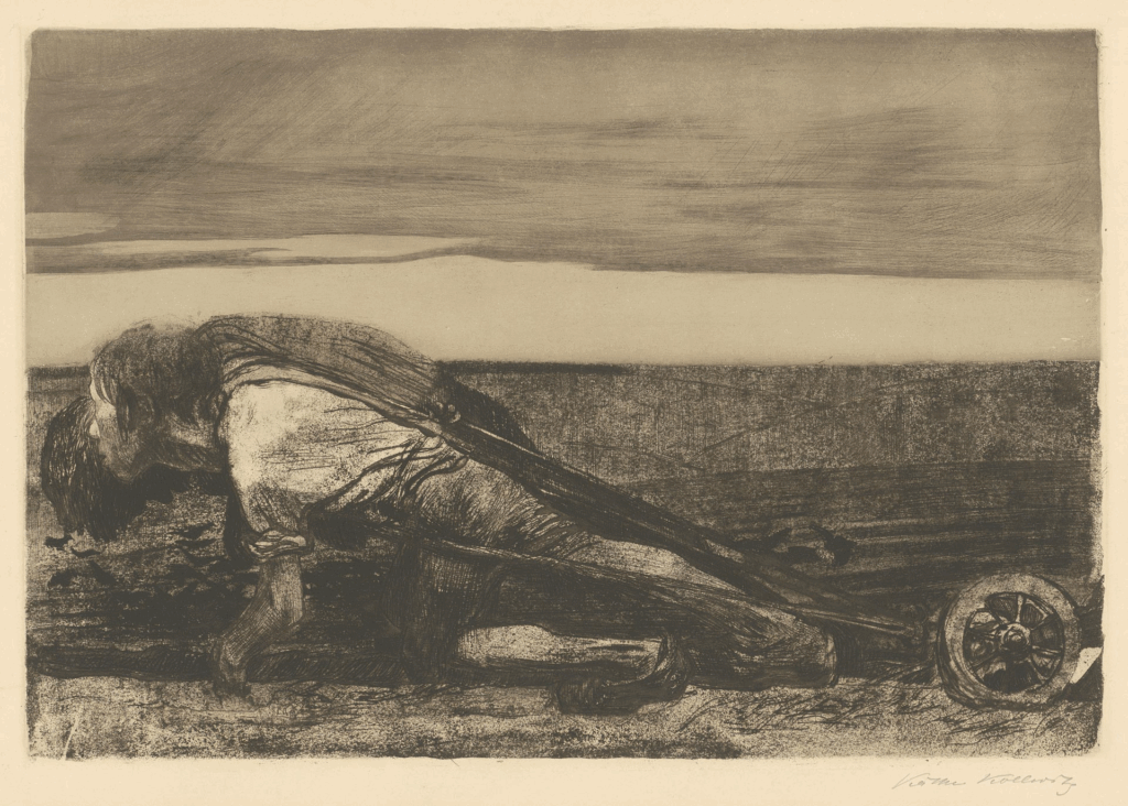 Käthe Kollwitz ilustra esto con dos campesinos, probablemente padre e hijo, que, a falta de animales de tiro, tuvieron que engancharse ellos mismos al arado.