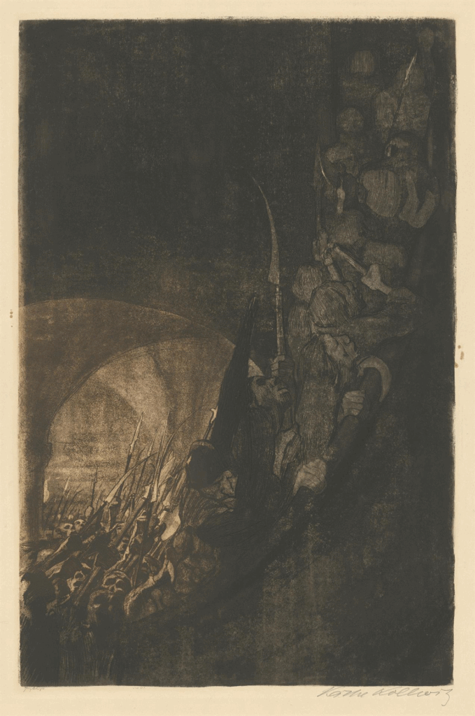 “En aquella época leí La Guerra de los Campesinos, de Zimmermann, donde se hablaba de “Anna la Negra”, una campesina que incitó a los campesinos. Entonces hice la gran lámina con la multitud de campesinos que se rebelaba” (Käthe Kollwitz, Diarios y cartas, 1948)
