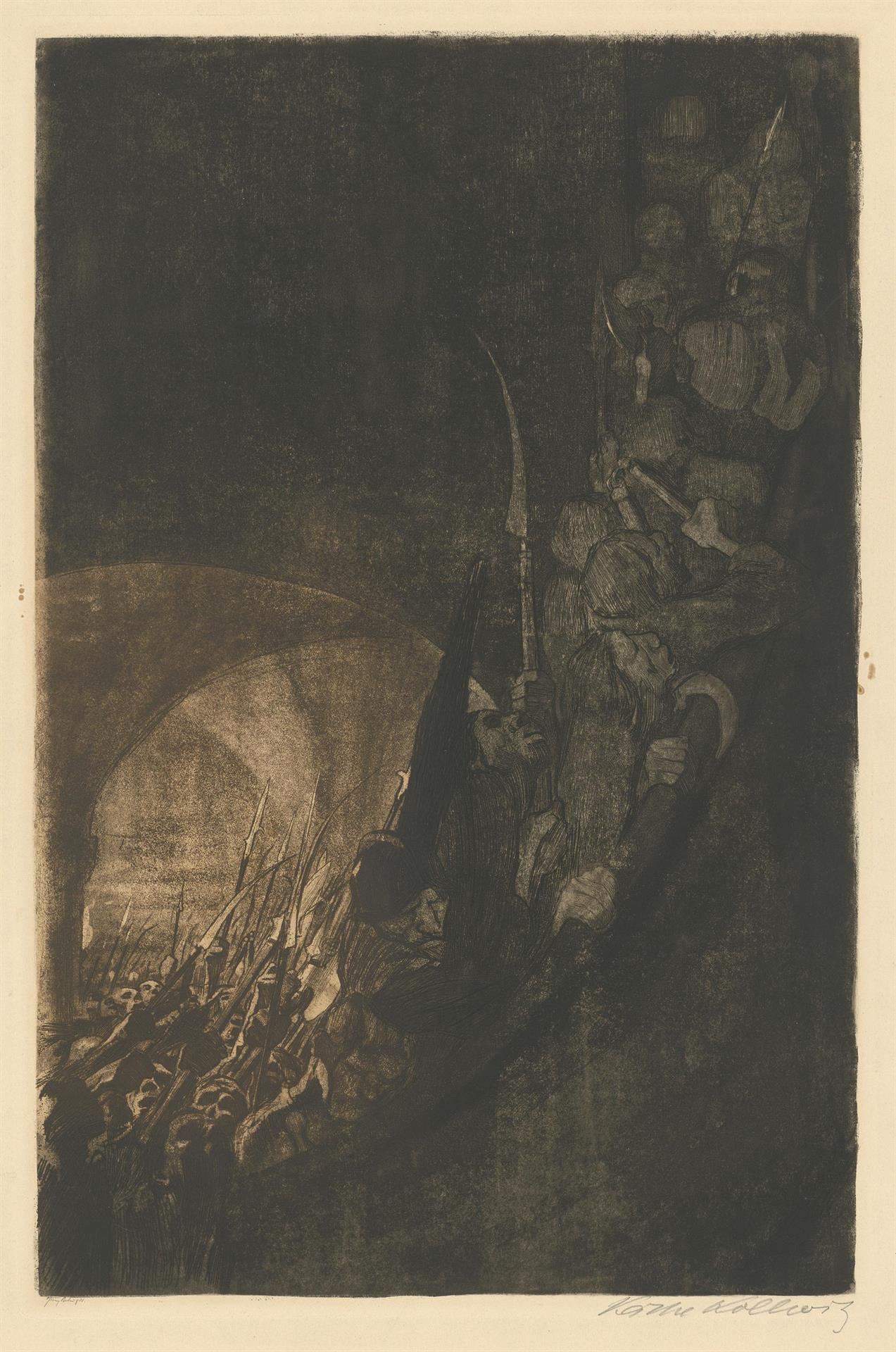 Al igual que en su primera serie gráfica, Ein Weberaufstand (“Una revuelta de tejedores”), Käthe Kollwitz vuelve a abordar un acontecimiento histórico en su segundo ciclo, inspirada por el tratado del teólogo e historiador Wilhelm Zimmermann, publicado en 1843, sobre la gran Guerra de los Campesinos alemana del siglo XVI. El hecho de que también los círculos socialdemócratas se refieran a esta lectura pone de manifiesto que la gran Guerra de los Campesinos alemana de 1524/25 no es un pasado lejano para el entorno liberal-socialista de Käthe Kollwitz, sino que tiene actualidad.