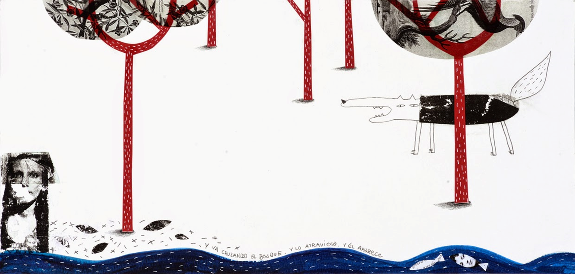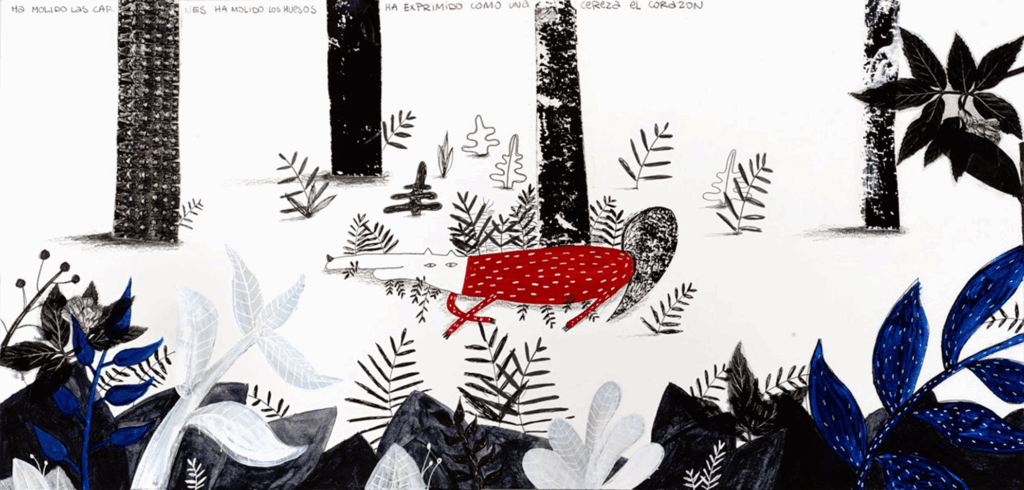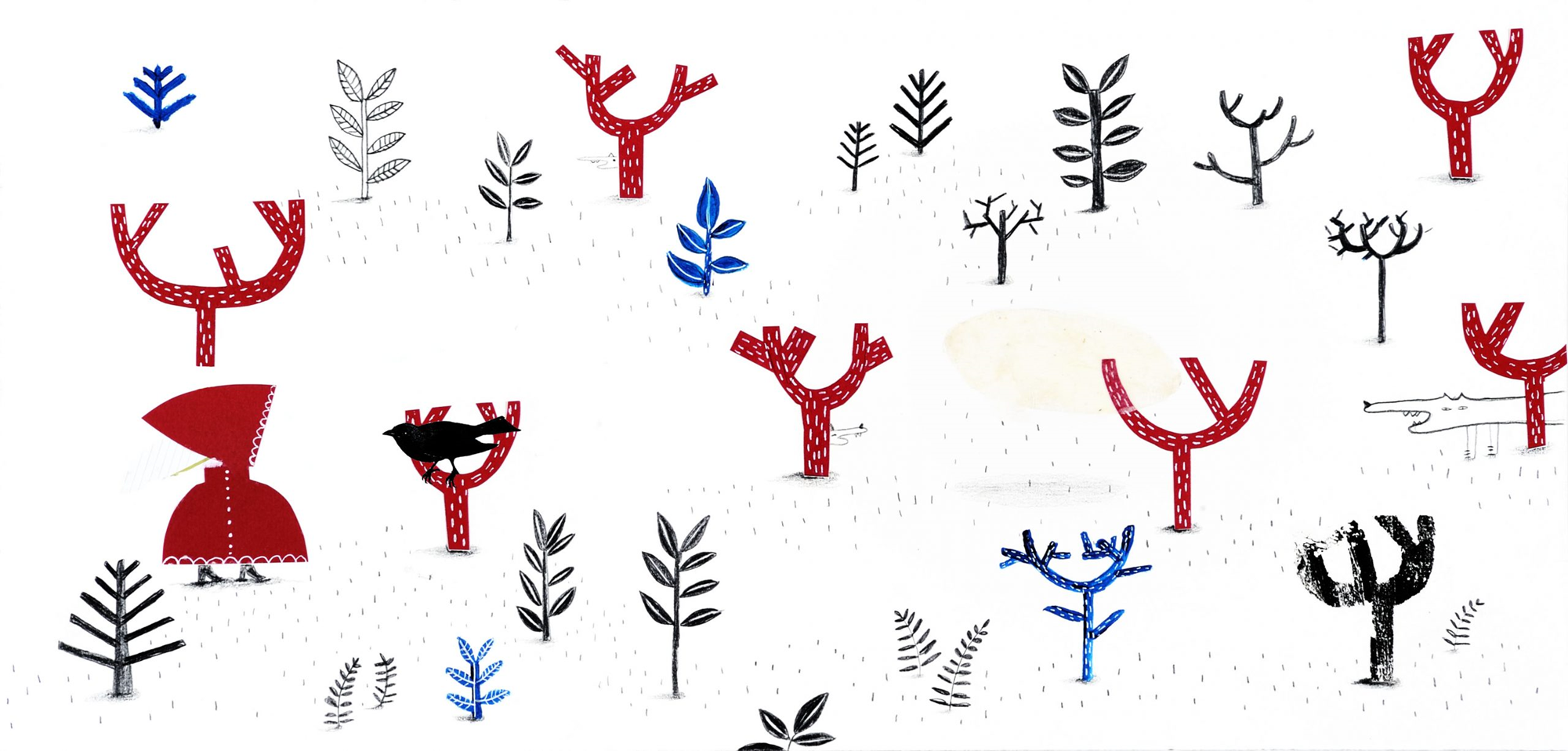 Ilustración de la serie Caperucita, de Florencia Aristarain, basada en el poema Caperucita Roja de Gabriela Mistral. Técnica mixta, 2014. Gentileza de la autora.